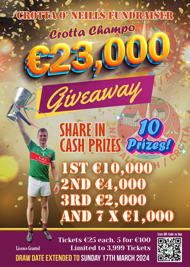Tickets available 3 for €5 online visit www.crottagaa.club or this link https://play.clubforce.com/play_newa.asp?ll_id=427#Anchor or Herbert’s Bar/Village Store, Parker’s Pub, Zam Zam Kabab, Foley Shop Lixnaw, Abbeydorney Post Office or from Club ticket sellers. Many thanks to all who contribute to our weekly Club Lotto. The Club cannot emphasise enough the importance of our members promoting the Club Lotto among family, friends, and work colleagues. Your continued support is greatly appreciated.